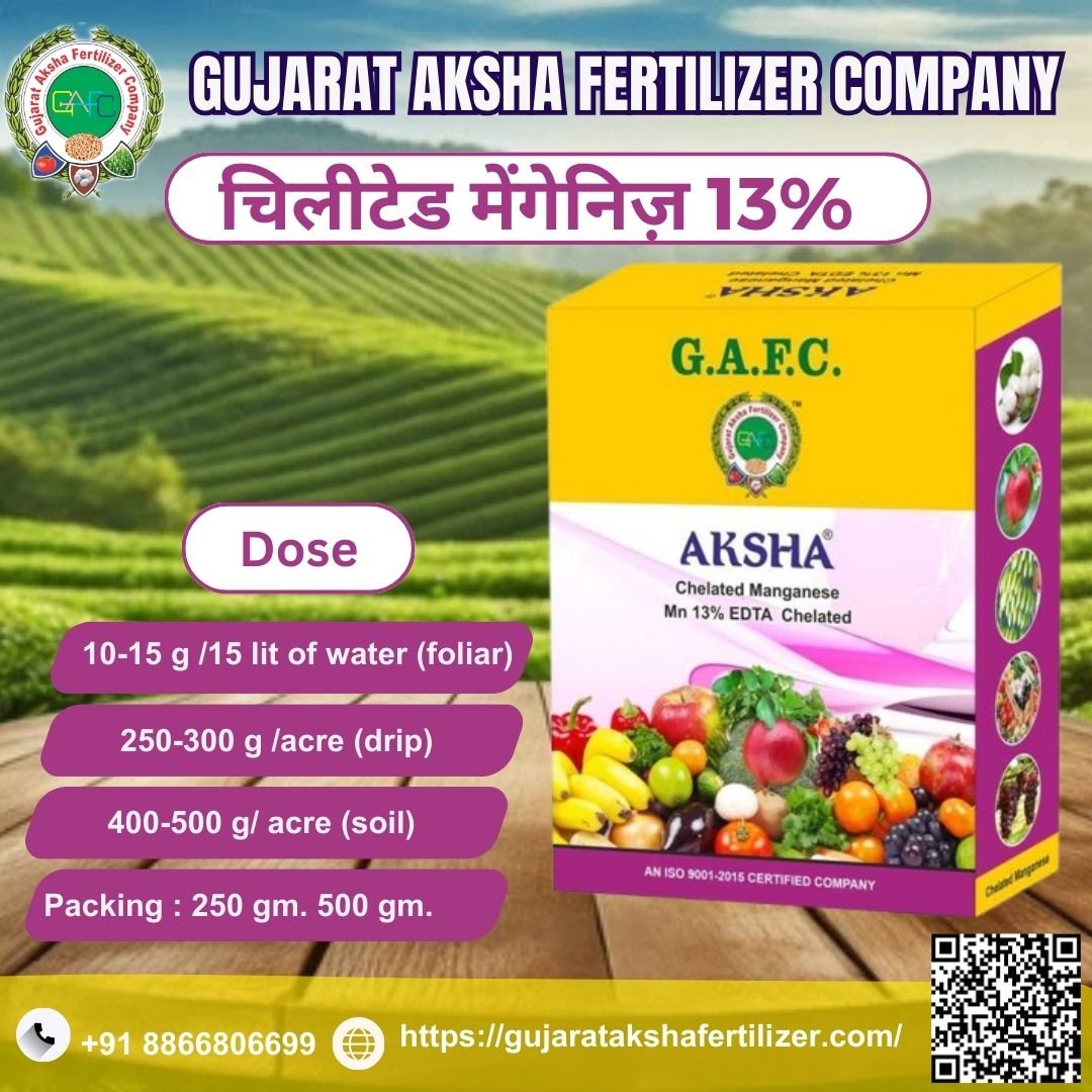 Chelated Manganese 13% Fertilizer effectively prevents manganese deficiency, enhances photosynthesis, improves chlorophyll production, and strengthens overall plant health, making it ideal for vegetables, fruits, cereals, pulses, and oilseeds.