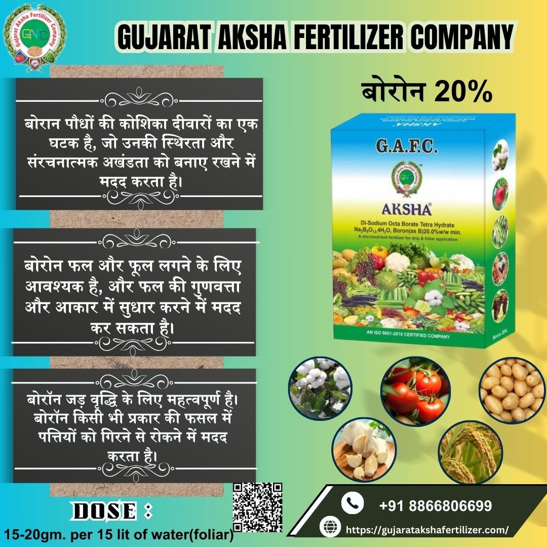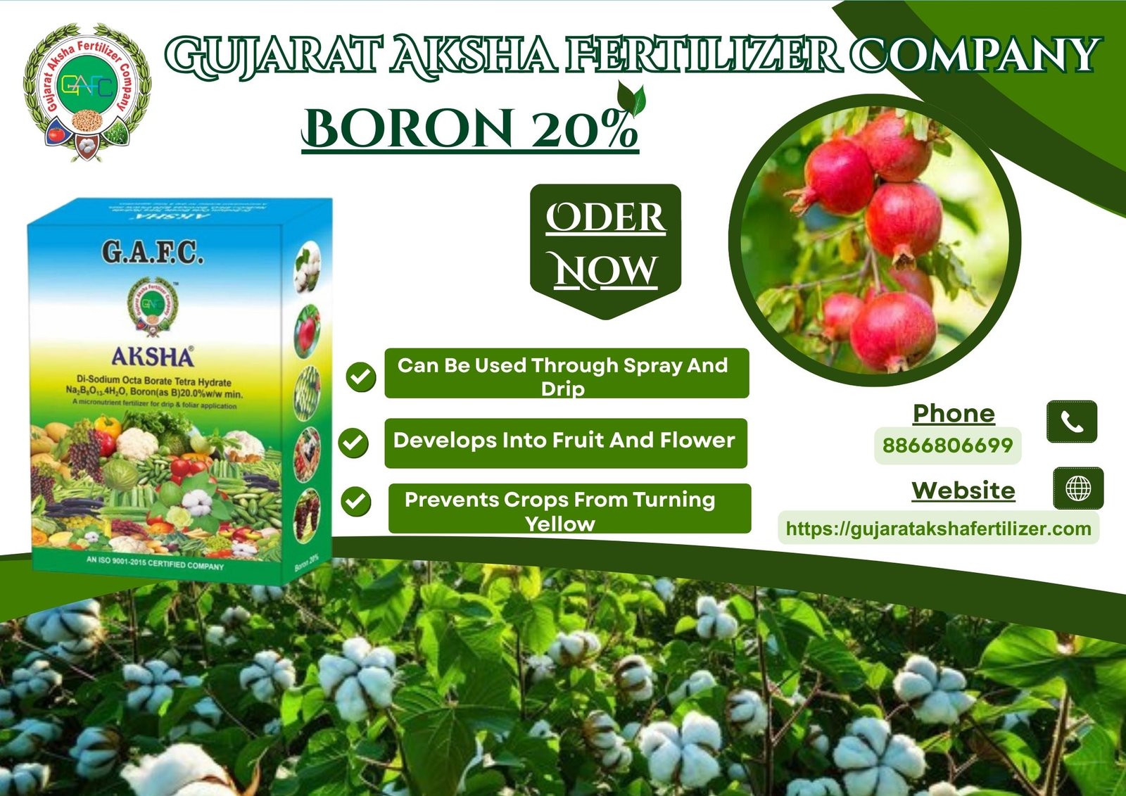 Di-Sodium Octa Borate Tetra Hydrate Boron 20% Fertilizer prevents Boron deficiency, improves flowering, enhances fruit setting, and strengthens plant structure, making it ideal for vegetables, fruits, cereals, oilseeds, and pulses.