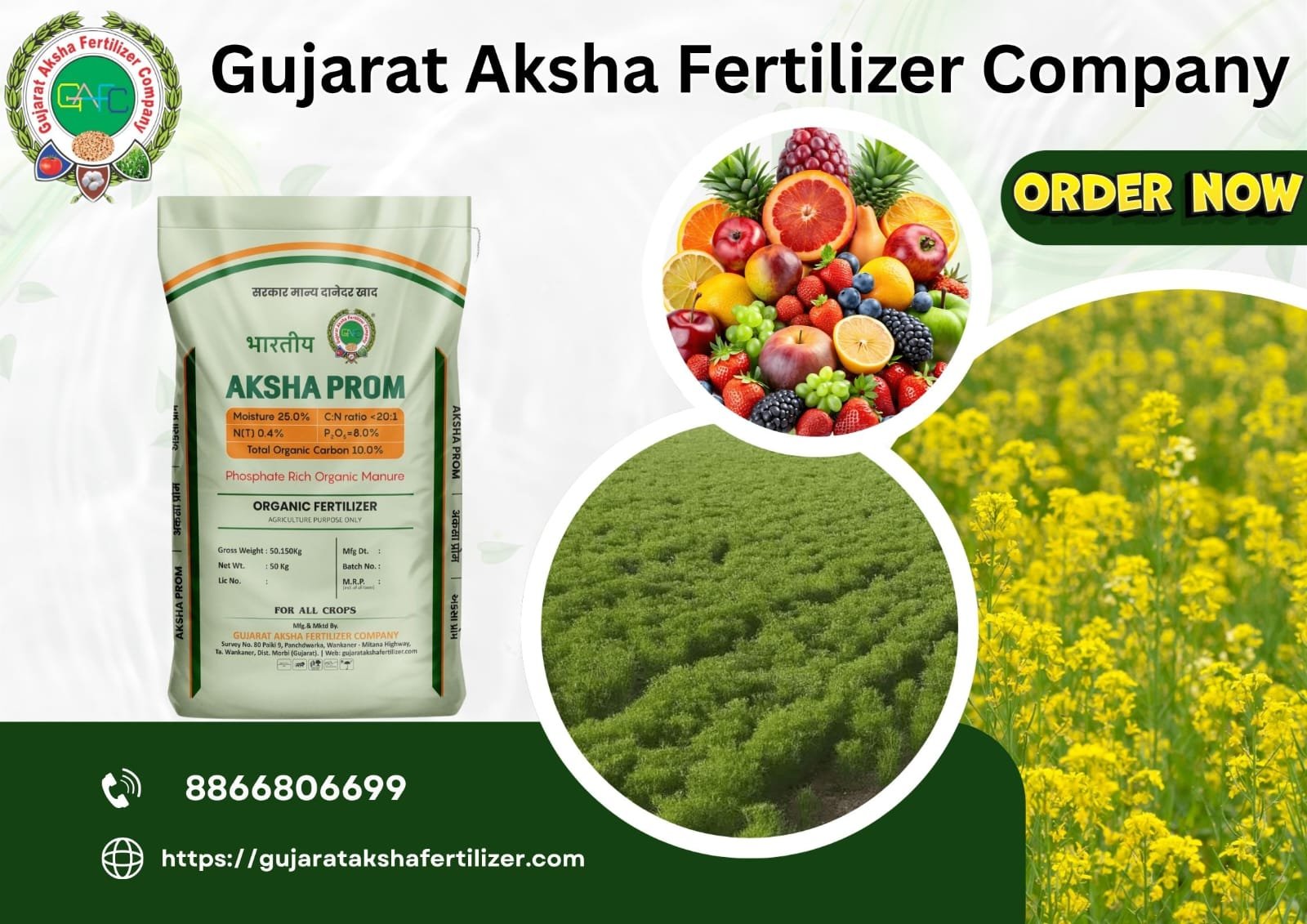 Aksha PROM Fertilizer is an excellent phosphorus-rich organic alternative that improves soil fertility, promotes root growth, and enhances overall crop yield in a sustainable manner.